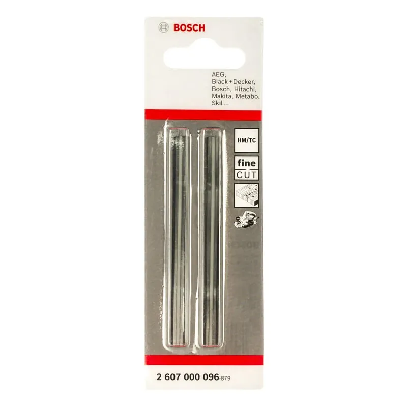 Ножи Bosch 2.607.000.096 имеют прямую форму и изготовлены из твердого сплава. Их применяют в рубанках следующих фирм: Bosch, AEG, Black & Decker, Fein, Haffner, Hitachi, Holz-Her, Mafell, Makita, Metabo, Skil. Это двухсторонняя оснастка, поэтому при затуплении одной режущей кромки достаточно переустановить нож противоположной стороной и продолжить работу остро заточенной кромкой.